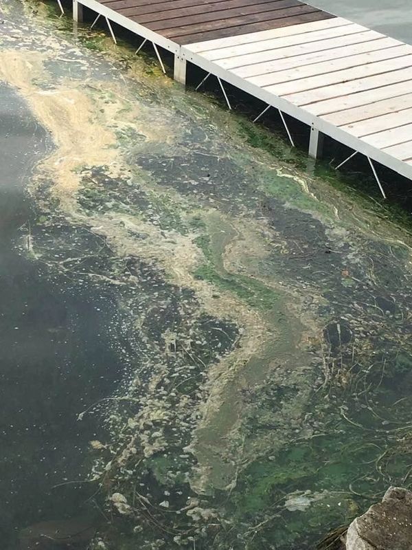 Streaky, paintlike formation near dock on Canadarago Lake, July 2021